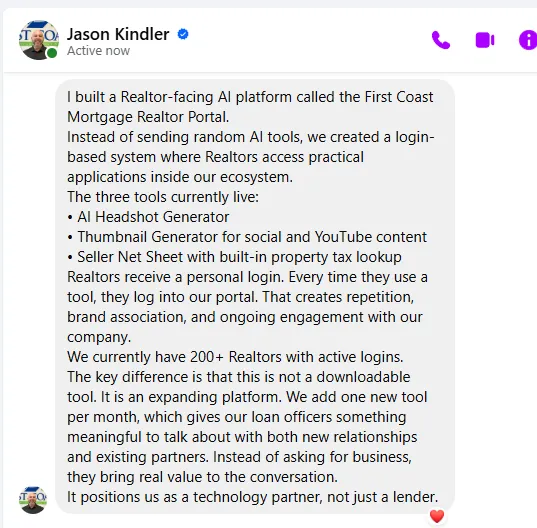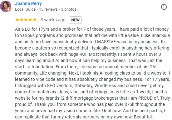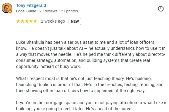 I've been in mortgage marketing for 8+ years. I've managed over $3 million in ad spend for loan officers. I've built Duplico, our AI content platform, from scratch using AI. And I run a community of 175+ LOs who are using this stuff right now.